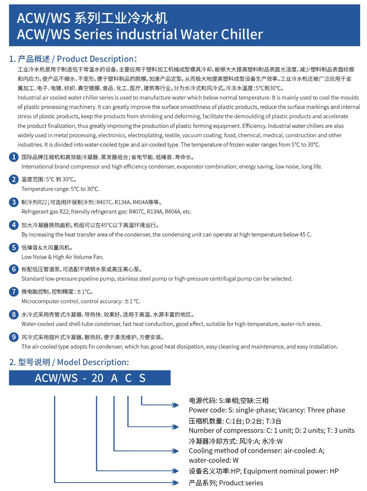 工業(yè)冷水機(jī)是用于制造低于常溫水的設(shè)備,主要應(yīng)用于塑料加工機(jī)械成型模具冷卻,能夠大大提高塑料制品表面光潔度,減少塑料制品表面紋痕和內(nèi)應(yīng)力,使產(chǎn)品不縮水、不變形,便于塑料制品的脫模,加速產(chǎn)品定型,從而極大地提高塑料成型設(shè)備生產(chǎn)效率。工業(yè)冷水機(jī)還被廣泛應(yīng)用于金屬加工、電子、電鍍、紡織、真空鍍膜、食品、化工、醫(yī)療、建筑等行業(yè)。分為水冷式和風(fēng)冷式。冷凍水溫度:5℃到30℃。